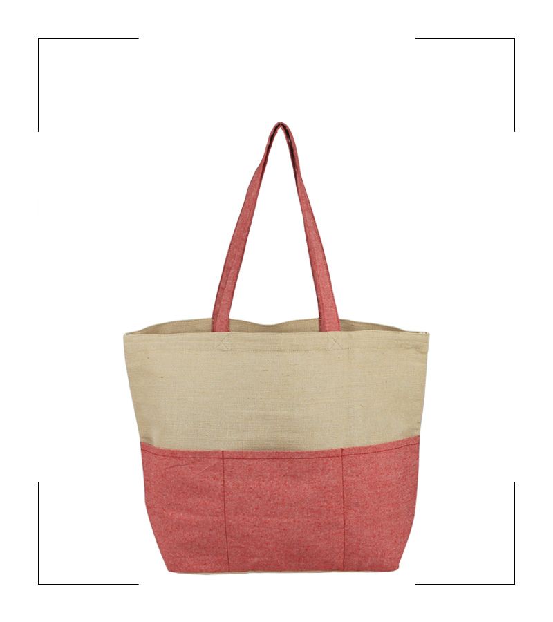 Front pockets and handles in 6 Oz Recycled Fabric Cotton with unlaminated Juco attached. The Bag is Lightweight.