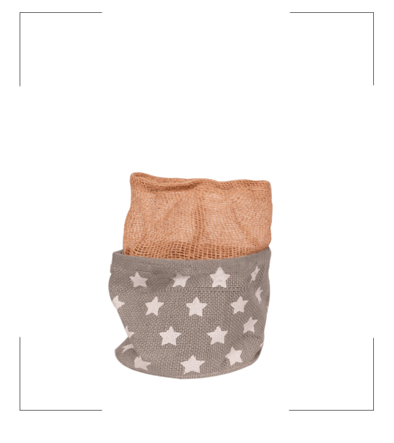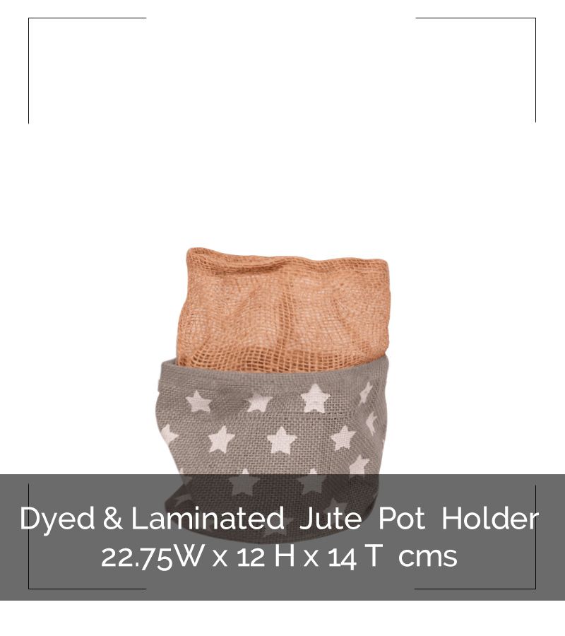 Dyed and Laminated Jute Pot Holder with Allover Print and Mesh Jute Attachment.